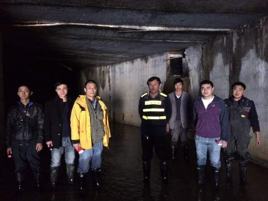 图为:贵阳市、花溪区环保监察部门、贵阳公众环境教育中心、花溪区检察院、水务局,贵阳市城投公司和贵州大学二期工程施工单位,联合进入养牛大沟暗洞进行调查。